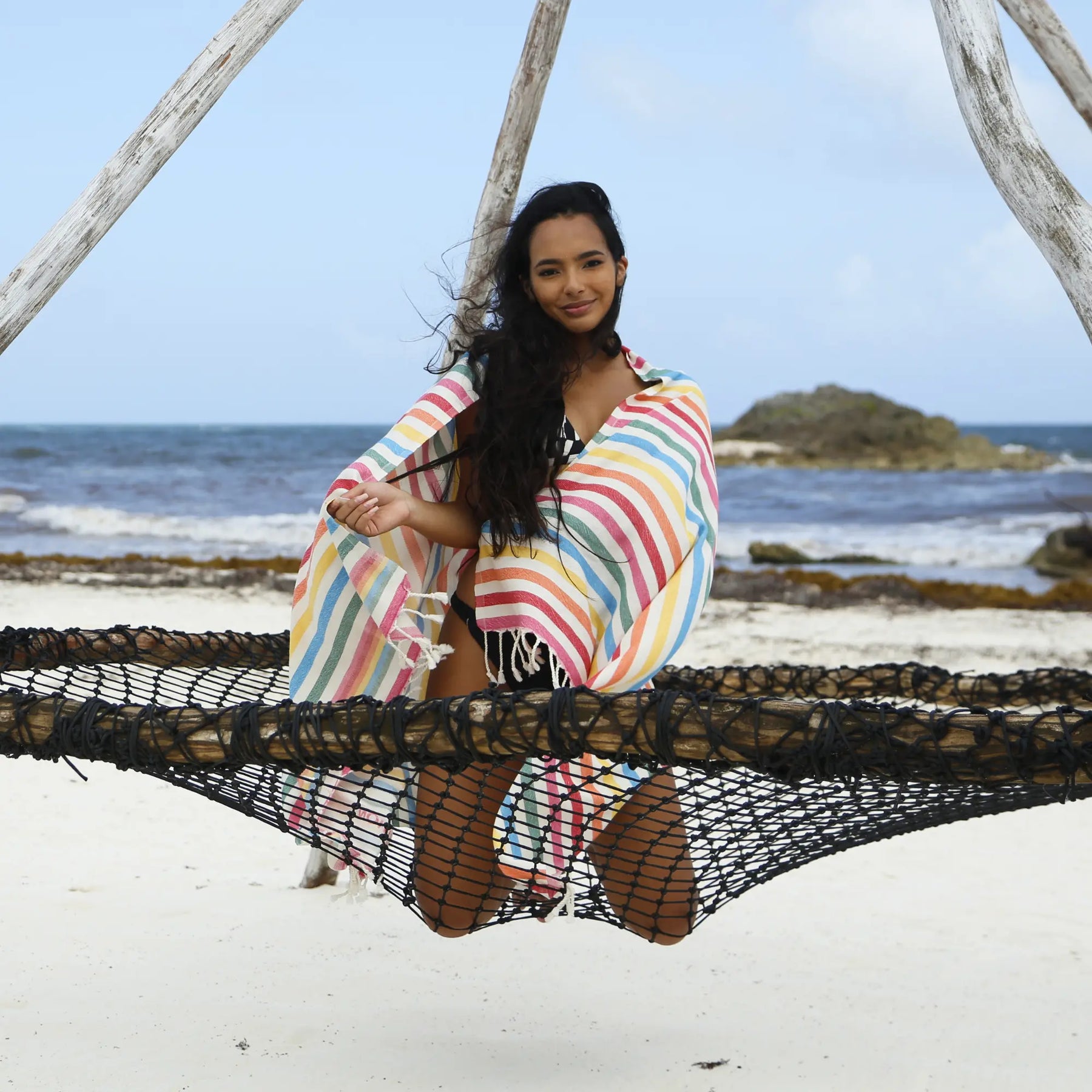 Model showcasing Ocean Kai Peacook Beach Towel with vibrant stripes at a stylish bar setting.