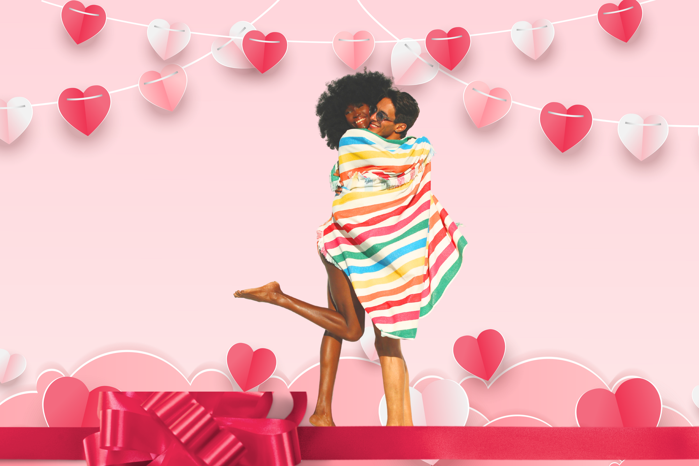 Couple enjoying summer vibes, wrapped in orange and white striped towels, laughing by the pool. Couple embracing by a pool wrapped in colorful striped towels, enjoying a sunny day.